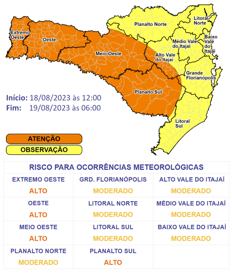 Estes temporais vêm acompanhados de descargas elétricas, rajadas de vento e eventual queda de granizo, iniciando nas áreas de divisa com o Rio Grande do Sul a partir da tarde da sexta-feira (18) e avançando para as demais regiões do estado até a manhã do sábado (19).