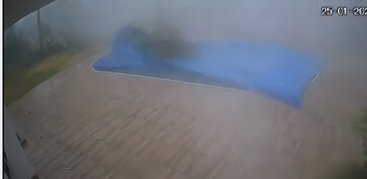 O temporal arrancou parte do telhado da casa, além de quebrar algumas árvores e arrastar objetos.
