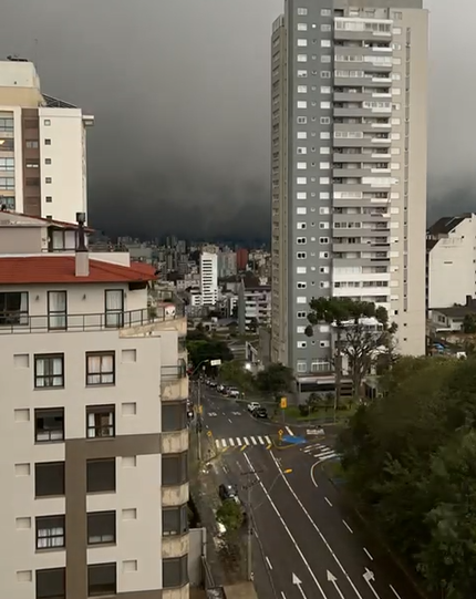 Uma gigantesca nuvem de tempestade encobriu o céu da cidade de Caxias do Sul, na Serra do Rio Grande do Sul, na manhã deste sábado (23), por volta das 11h. O vídeo registra a imensa nuvem avançando sobre os prédios, acompanhada de escuridão, raios, trovoadas e uma intensa precipitação.