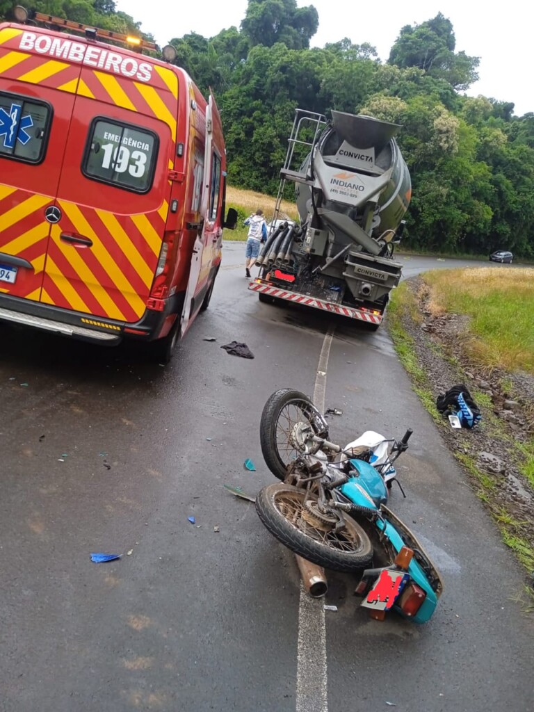 Na manhã deste sábado (8), um acidente de trânsito envolvendo uma motocicleta e um caminhão foi registrado na Linha Zona Alta, em Piratuba, no Oeste de Santa Catarina. O condutor da motocicleta Honda CG-125 Titan, de 24 anos, ficou gravemente ferido.