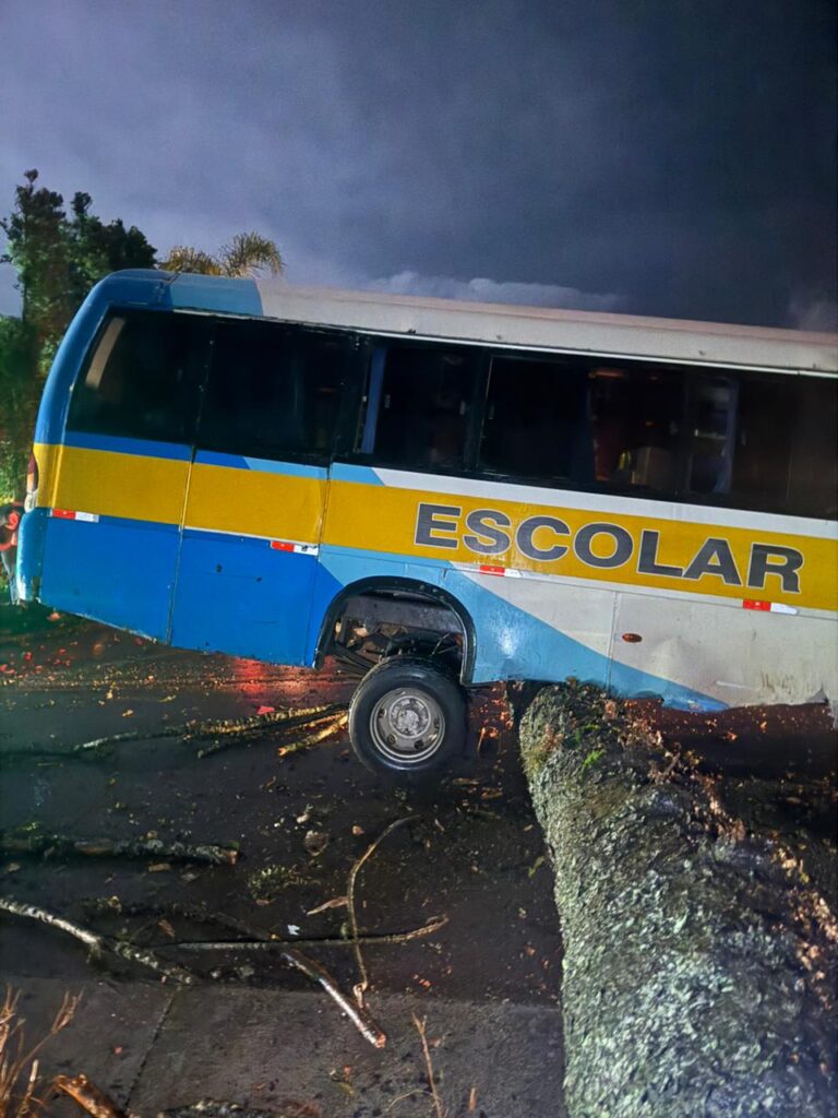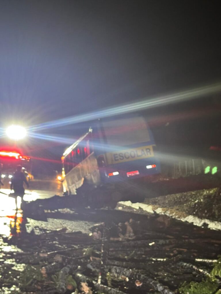 Um ônibus colidiu contra uma araucária caída sobre a pista na noite desta terça-feira (17), por volta das 21h, na SC-305, km 26,800, em Campo Erê, no Oeste de Santa Catarina. O acidente resultou apenas em danos materiais e não houve feridos.