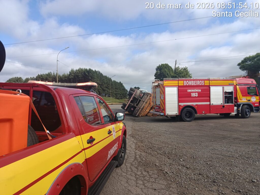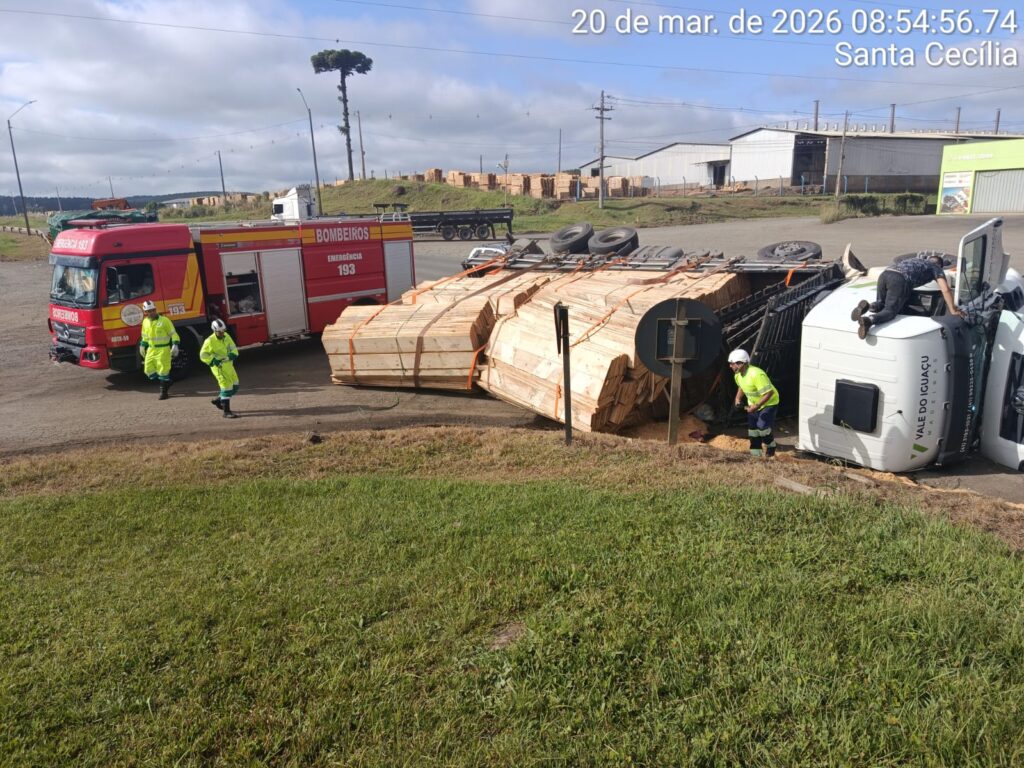De acordo com o Corpo de Bombeiros Militar, o veículo, um caminhão trator Volkswagen 30.330, de cor branca, estava carregado com madeira serrada quando sofreu tombamento lateral ao acessar a rodovia no sentido norte.