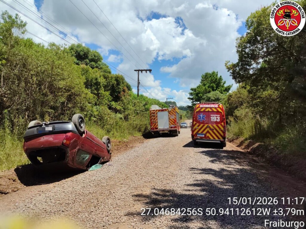 Uma jovem de 21 anos ficou ferida após um acidente de trânsito registrado na manhã desta quinta-feira (15), por volta das 11h05, na Avenida Guilherme Pinz, no bairro São Miguel, em Fraiburgo, no Meio-Oeste de Santa Catarina. O atendimento foi realizado pelo Corpo de Bombeiros Militar de Fraiburgo. No local, as equipes constataram que se tratava de uma saída de pista seguida de capotamento, envolvendo um Fiat Palio vermelho, que ficou capotado sobre a via.