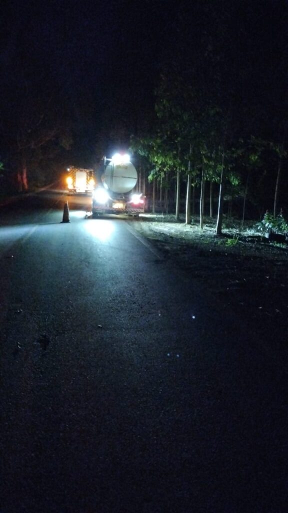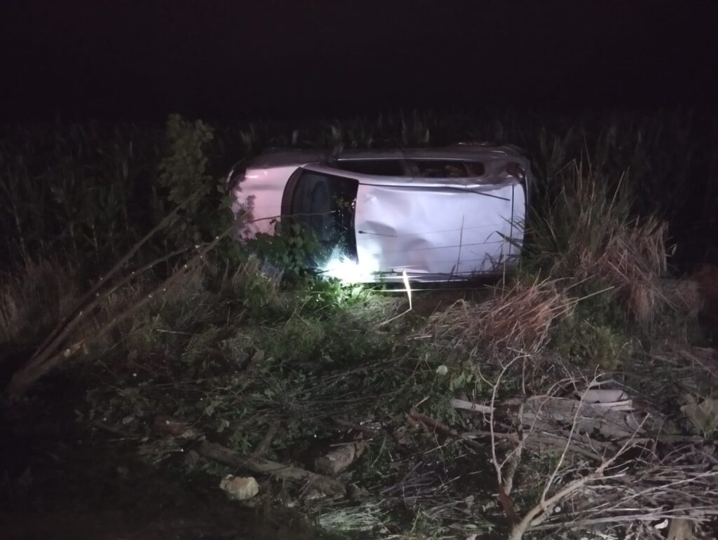 No local, os bombeiros constataram uma colisão entre um carro e um caminhão, seguida de capotamento e saída de pista. O automóvel estava virado fora da via, mas seus quatro ocupantes – três homens e uma mulher, todos maiores de idade – encontravam-se conscientes, orientados e sem ferimentos aparentes.