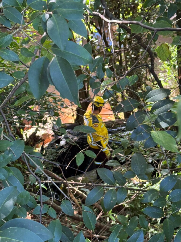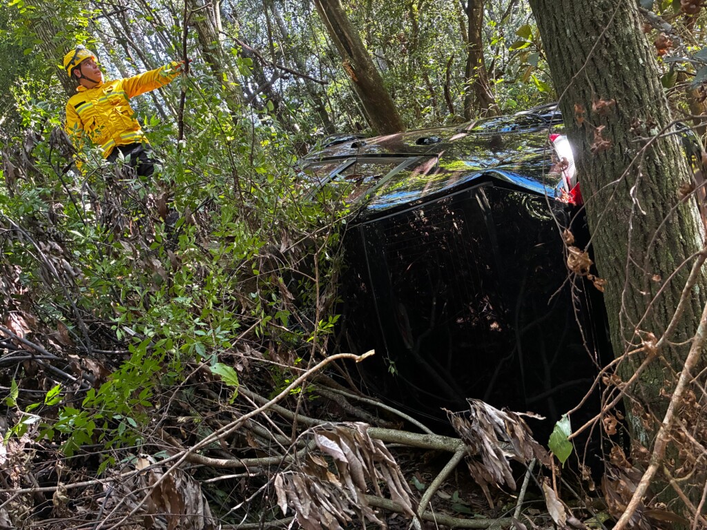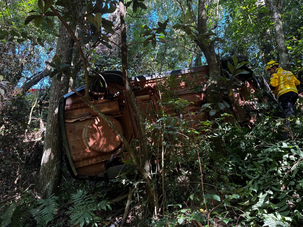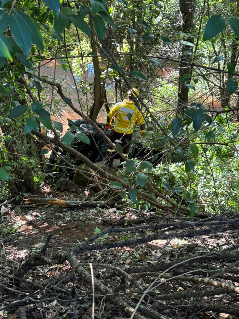 O chamado foi registrado por volta das 16h10. No local, os socorristas confirmaram a ocorrência de saída de pista seguida de tombamento. O veículo ficou lateralizado e preso entre árvores após a queda.