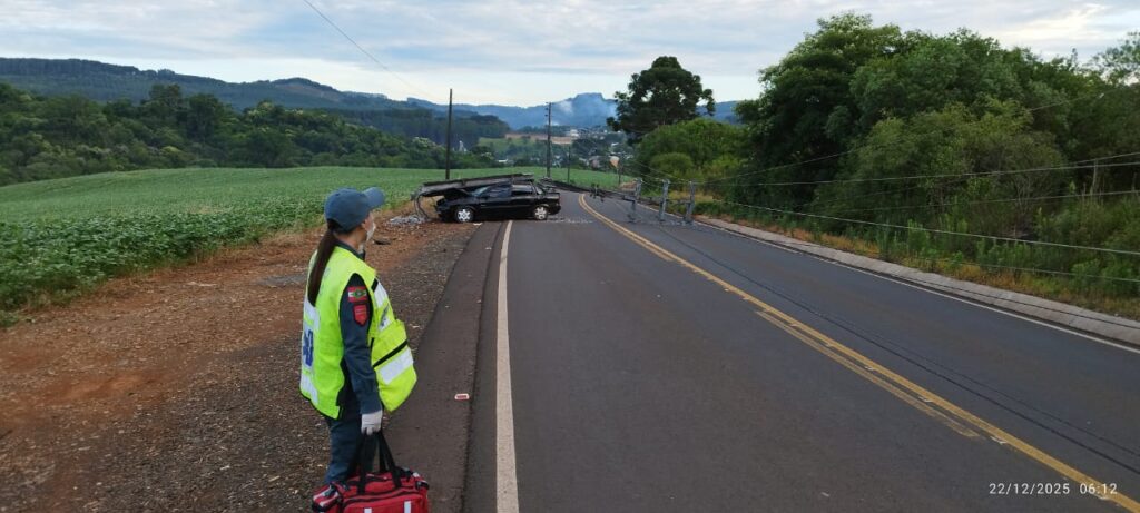 Um acidente de trânsito registrado na manhã desta segunda-feira (22) mobilizou o Corpo de Bombeiros Militar em Barra Grande, no Oeste de Santa Catarina. Um veículo saiu da pista e colidiu contra um poste, provocando a queda da estrutura e a interdição total da via.