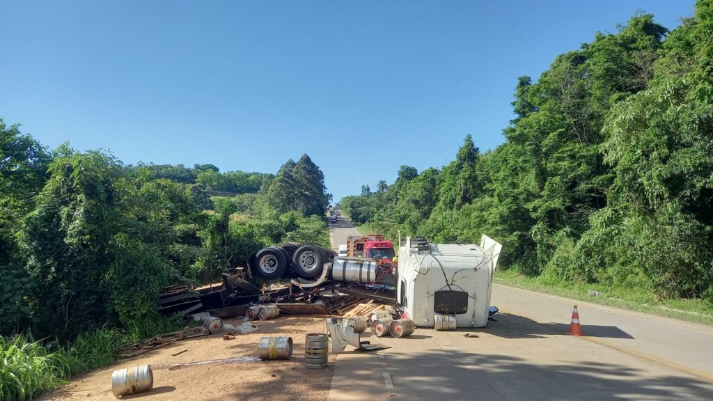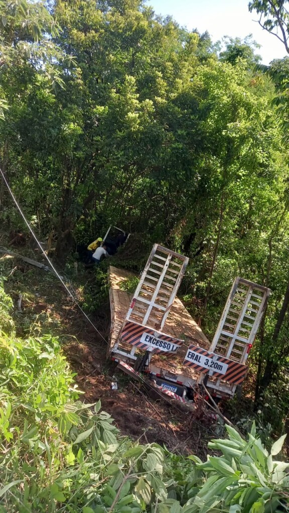 Três pessoas ficaram feridas em um grave acidente de trânsito registrado na tarde desta quarta-feira (22), por volta das 15h28, na BR-163, na comunidade de Linha Guataparema, no interior de Guaraciaba, no Extremo-Oeste catarinense. De acordo com o 12º Batalhão de Bombeiros Militar, a ocorrência envolveu um caminhão prancha Ford Cargo, de Guaraciaba, carregado com um rolo compactador, e uma carreta Scania, com placa Mercosul, transportando bebidas. Com o impacto da colisão traseira, o caminhão saiu da pista e despencou em uma ribanceira de aproximadamente 70 metros. Parte da carreta também acabou deslizando e ficando presa na encosta.