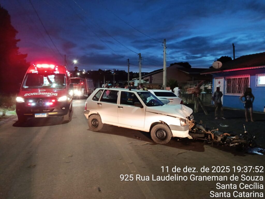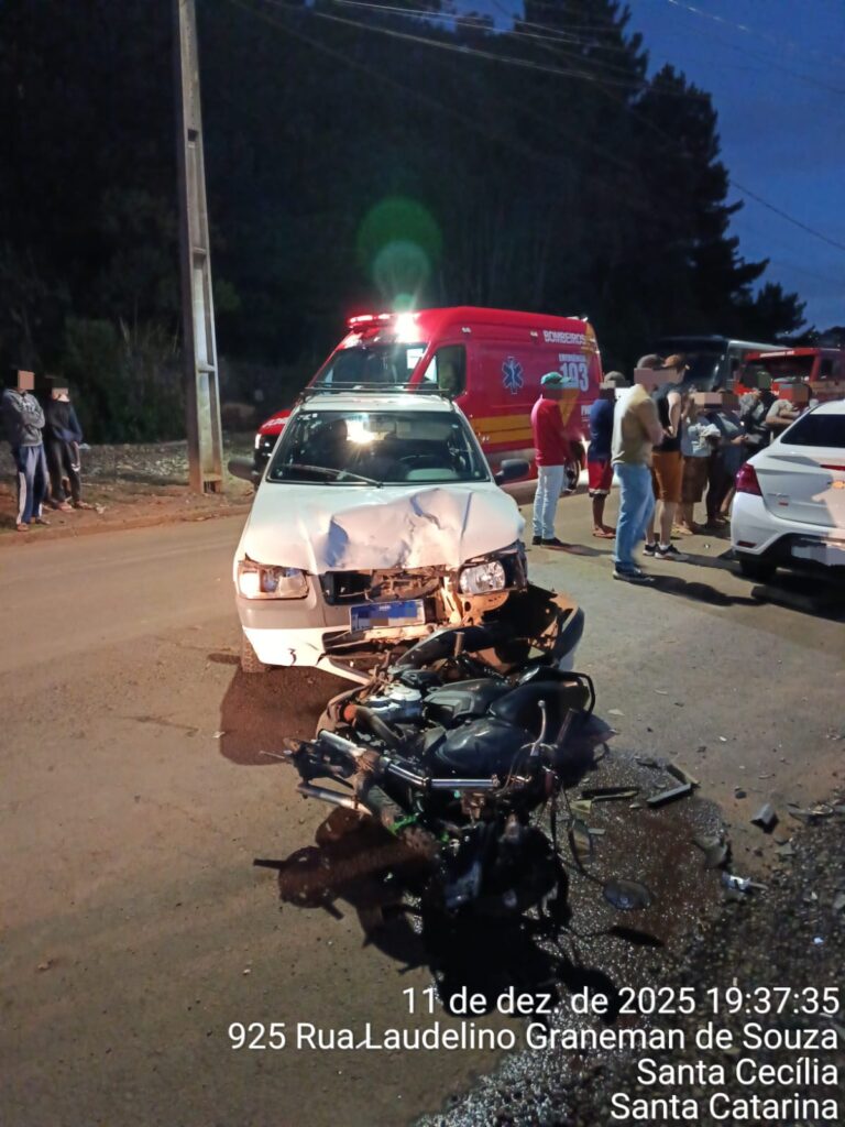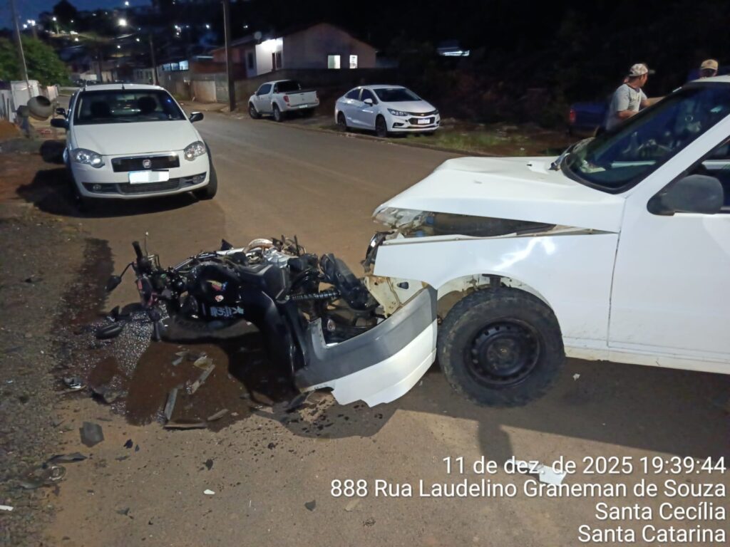 Um motociclista de 29 anos ficou ferido após uma colisão frontal entre um Fiat Uno e uma Yamaha Factor 150 na noite desta quinta-feira (11), em Santa Cecília, no Oeste de Santa Catarina. O acidente ocorreu por volta das 19h24, na Rua Laudelino Granemamm de Souza, no bairro Nossa Senhora Aparecida.