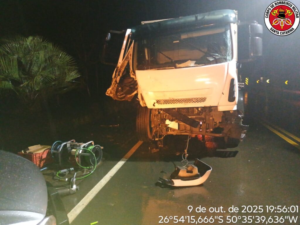Três pessoas ficaram feridas — duas delas em estado crítico — após um grave acidente de trânsito na SC-350, na localidade de Rio Bonito, entre os municípios de Lebon Régis e Santa Cecília, na noite desta quarta-feira (09). A colisão transversal envolveu um veículo VW Polo e um caminhão Iveco Tector 310.