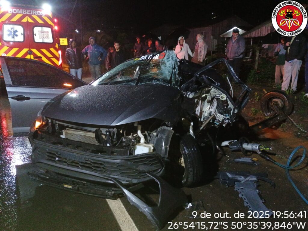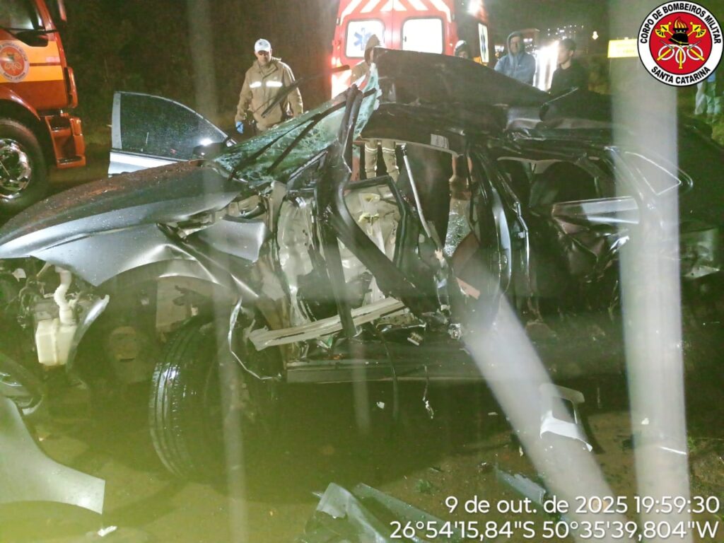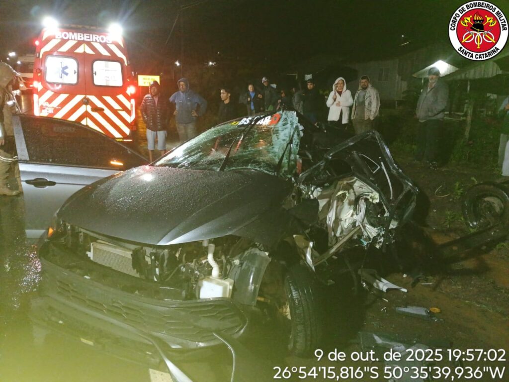 O Corpo de Bombeiros Militar de Lebon Régis foi acionado por volta das 19h18, via COBOM, e encontrou as três vítimas presas às ferragens no interior do automóvel.