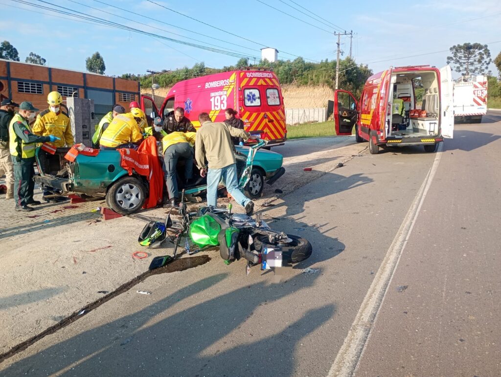 Um grave acidente de trânsito foi registrado às 6h53 deste domingo (01) na BR-280, no bairro Quitandinha, em Rio Negrinho. A colisão envolveu uma Volkswagen Parati e uma motocicleta Kawasaki Z650 e deixou três pessoas feridas, uma delas em estado grave.
