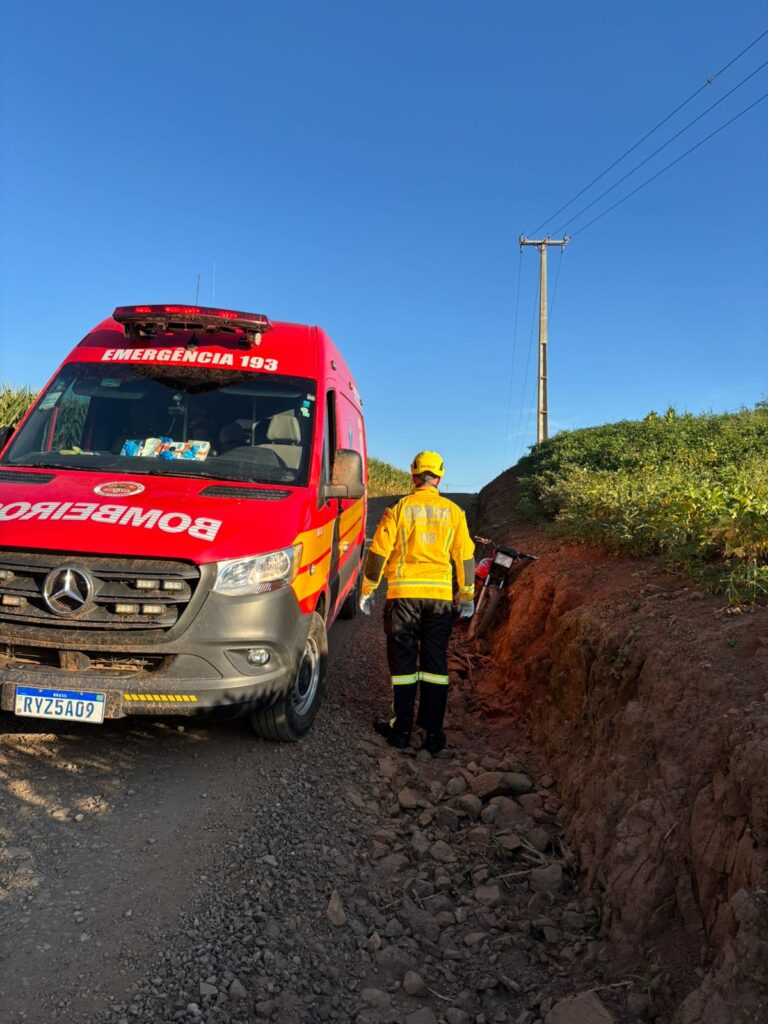 Um homem de 40 anos ficou ferido após cair da motocicleta que conduzia na tarde de domingo, na Linha Pindorama, interior de Cunha Porã. A ocorrência foi registrada por volta das 17h44min e atendida pela equipe do Corpo de Bombeiros Militar do município.