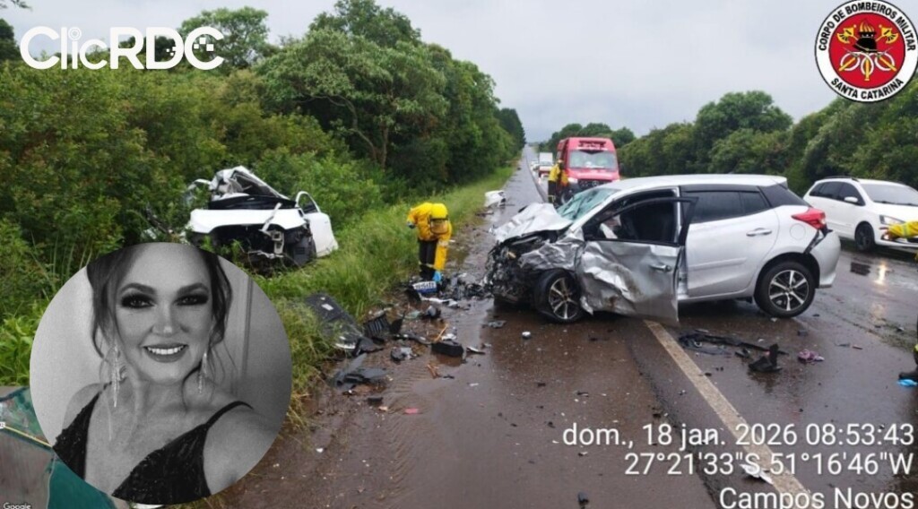 Neiva Junges, de 50 anos, morreu na manhã deste domingo (18) em um grave acidente registrado na BR-282, em Campos Novos, no Meio-Oeste de Santa Catarina. Ela estava no Toyota Yaris com o marido, que conduzia o veículo e foi socorrido em estado grave, apresentando múltiplos ferimentos e suspeita de traumatismo cranioencefálico.