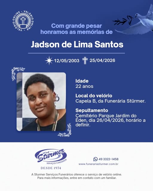 Familiares e amigos se despedem de Jadson neste domingo (26). O velório ocorre na Capela B da Funerária Stürmer, e o sepultamento está previsto para o Cemitério Parque Jardim do Éden.