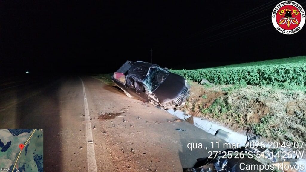 De acordo com o Corpo de Bombeiros Militar, a ocorrência foi registrada por volta das 20h18, quando as equipes do quartel de Campos Novos foram acionadas para prestar apoio à Unidade de Suporte Básico do SAMU em um atendimento de saída de pista seguida de capotamento.