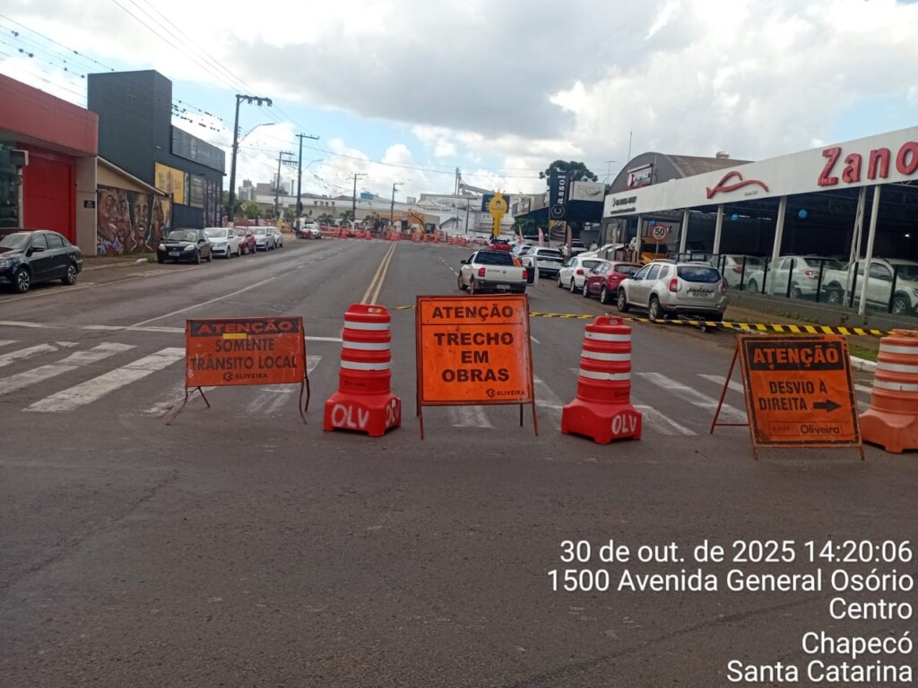 A Avenida General Osório, em Chapecó, foi interditada nesta quinta-feira (30) para a execução de obras de macrodrenagem. O trecho bloqueado fica entre a Avenida São Pedro e a Rua Paulo Marques e deve permanecer fechado por um período estimado entre sete e dez dias, segundo a Prefeitura.
