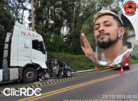 Foi identificado como Kauan Giorgie Rodrigues Zimmernmann, de 25 anos, o jovem que morreu em um grave acidente de trânsito registrado na madrugada desta terça-feira (23) na rodovia SC-355, em Fraiburgo, no Meio-Oeste de Santa Catarina. A colisão envolveu um carro de passeio e um caminhão carreta, e a vítima não resistiu aos ferimentos.