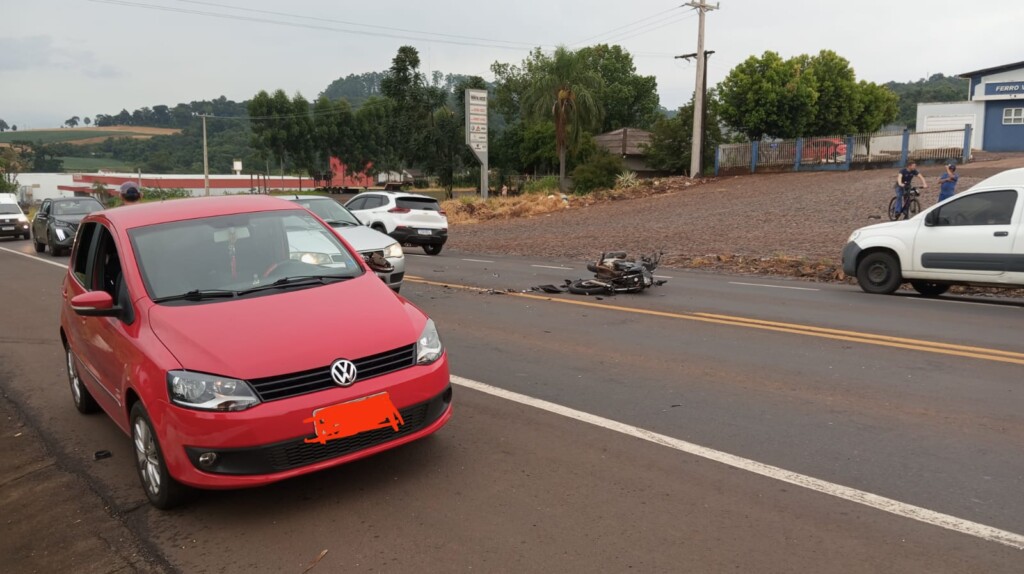 Um motociclista ficou gravemente ferido após se envolver em um acidente de trânsito na manhã desta terça-feira (3), na BR-282, em Pinhalzinho, no Oeste de Santa Catarina. A colisão lateral entre uma motocicleta e um automóvel ocorreu por volta das 11h44min, em frente ao Ferro Velho Silva.