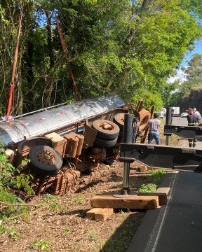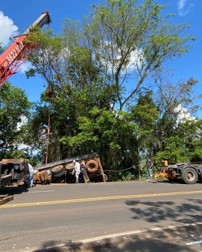 A BR-282 ficou interditada por mais de duas horas na tarde desta segunda-feira (27) devido ao tombamento de um caminhão entre os municípios de São Miguel do Oeste e Maravilha.