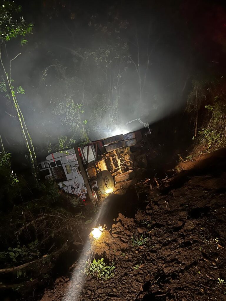 A ocorrência foi atendida pela viatura ASU-576, acionada via COBOM após a informação de uma saída de pista seguida de capotamento. Ao chegar ao local, os bombeiros encontraram o caminhão fora da rodovia, lateralizado, em uma ribanceira com aproximadamente 10 metros de altura. O veículo estaria carregado com ração, conforme relato do condutor.