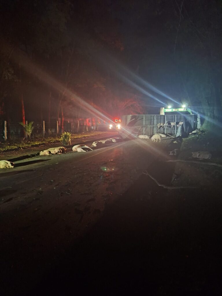 Com o tombamento, alguns suínos ficaram espalhados pela pista e outros presos nos compartimentos da carroceria. Parte dos animais não resistiu.