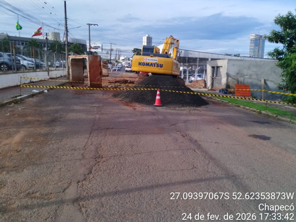 De acordo com o comunicado, a interdição é necessária para a execução da caixa de ligação da nova galeria com a antiga estrutura de drenagem. A intervenção integra as obras de macrodrenagem realizadas no município.