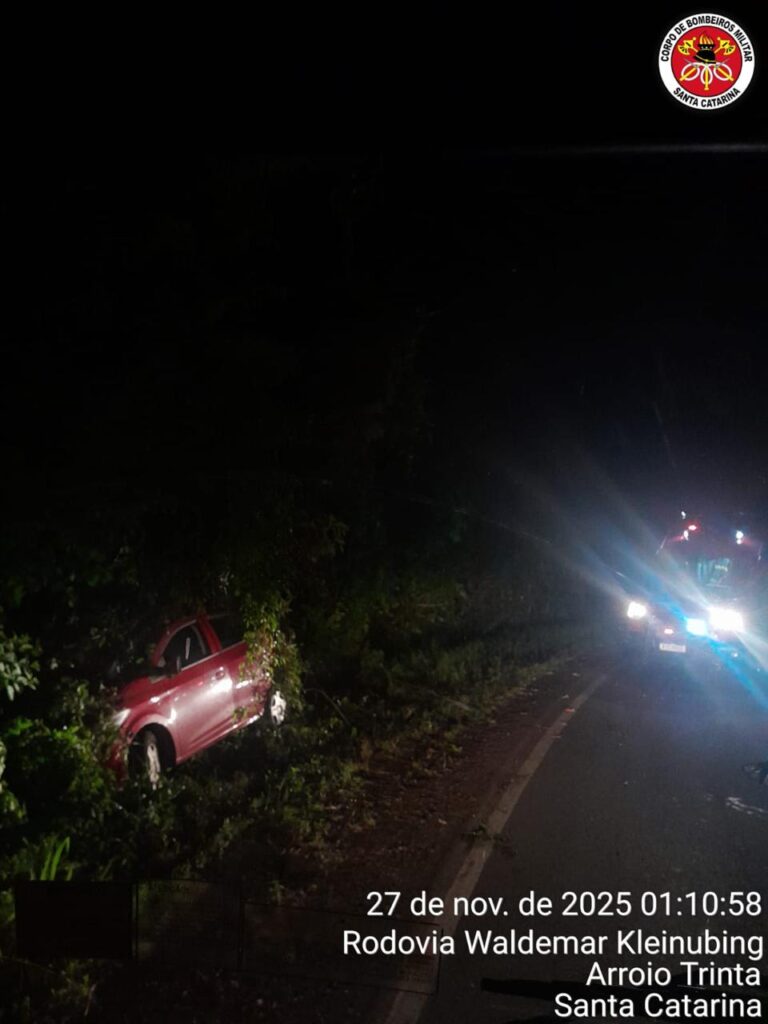 Bombeiros de Salto Veloso e equipes do SAMU atenderam três vítimas após um Prisma sair da pista durante a noite desta quarta-feira