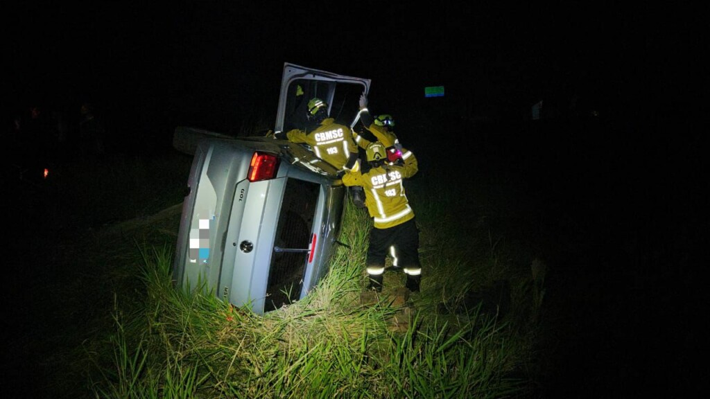 Um veículo VW/Gol, com placas de Chapecó, saiu de pista e tombou às margens da SC 157 próximo ao elevado Vitório Cella, que dá acesso a BR 480, em Chapecó.