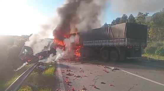 De acordo com a corporação, uma das carretas transportava soja e a outra, frutas. Com o impacto, parte das cargas ficou espalhada pela pista e no entorno. As chamas atingiram os veículos logo após a batida, sendo controladas pelo Corpo de Bombeiros por volta das 8h.