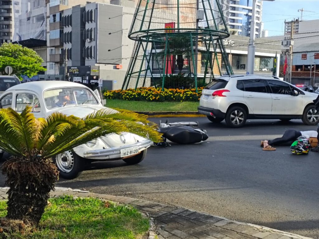 Um acidente de trânsito envolvendo uma motocicleta Honda Biz e um veículo Peugeot 308 foi registrado por volta das 7h25 da manhã desta quarta-feira (28), na avenida Getúlio Vargas, esquina com a rua Sete de Setembro, na rotatória da Ortobom, em Chapecó.