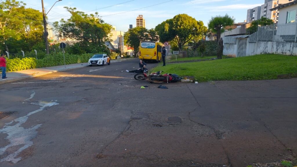 Um motociclista ficou ferido após uma colisão com um ônibus no início da manhã desta terça-feira (11), em Chapecó. O acidente foi registrado por volta das 6h30, na Rua Quatorze de Agosto, esquina com a Achiles Tomazeli, no Bairro Santa Maria, nas proximidades do Hospital Regional do Oeste (HRO).