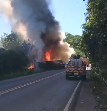 De acordo com a PMRv, o veículo pesado tombou e, em seguida, foi atingido por um incêndio. O motorista conseguiu sair do caminhão a tempo e não sofreu ferimentos. Não houve registro de vítimas.