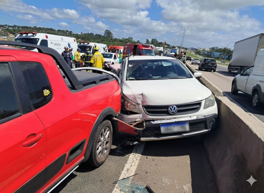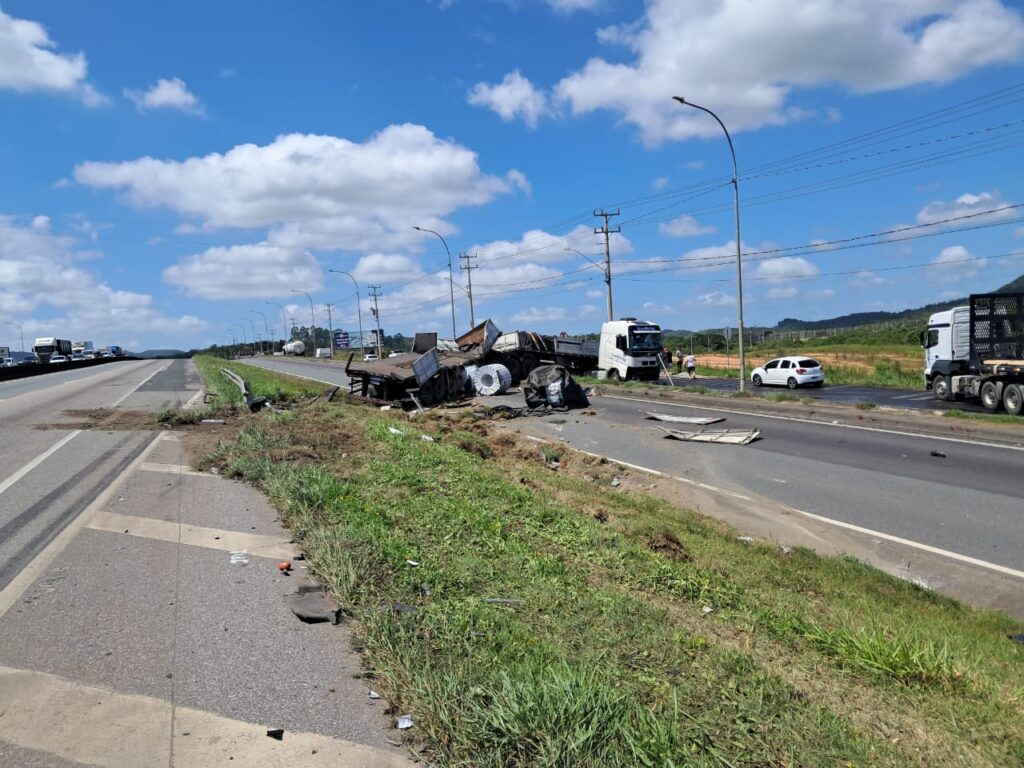 Um grave acidente de trânsito envolvendo uma carreta bitrem e quatro veículos foi registrado na manhã desta terça-feira (7), por volta das 9h49, no km 100 da BR-101, no município de Balneário Piçarras, no Litoral Norte de Santa Catarina. A colisão deixou uma pessoa encarcerada e provocou a interdição total da rodovia e da via marginal no sentido Sul.