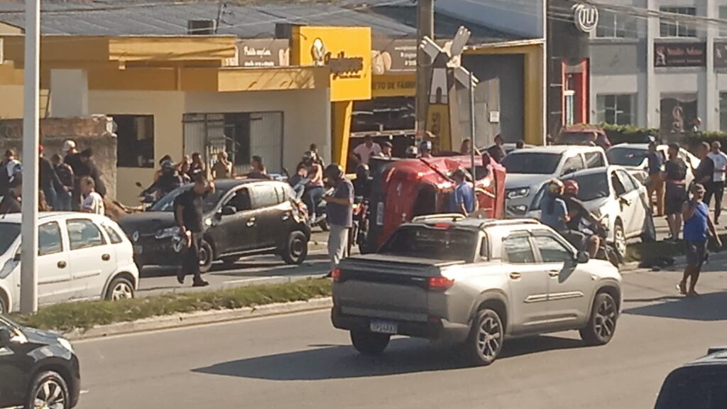 Um grave engavetamento seguido de capotamento envolvendo sete veículos foi registrado na tarde desta sexta-feira (13), no KM 6 da SC-403, sentido Ingleses, em Florianópolis. A ocorrência mobilizou guarnições da Polícia Militar Rodoviária e do 21º BPM, além do SAMU, que prestou atendimento pré-hospitalar a dois homens com ferimentos leves.