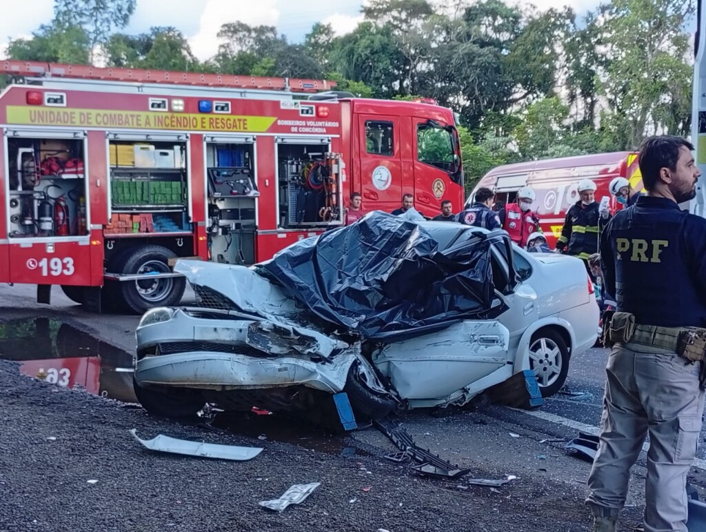 O acidente envolveu um Chevrolet Classic, com placas de Concórdia, e uma carreta M. Benz/Actros de Araucária (PR). O impacto frontal causou danos significativos ao carro, principalmente na parte frontal e lateral do lado do motorista.