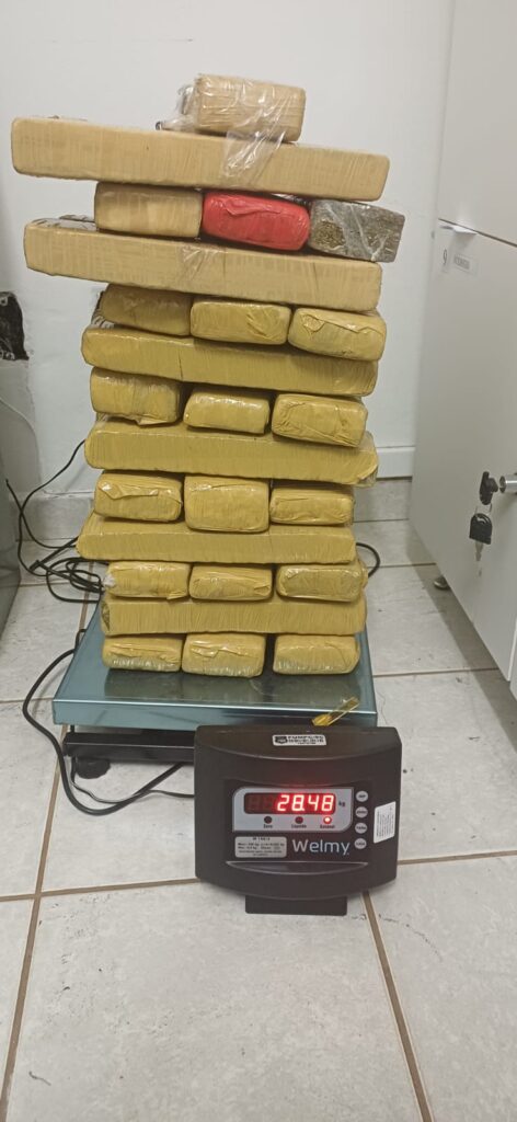 No interior do carro, os policiais encontraram uma mochila contendo aproximadamente 30 quilos de entorpecentes, entre skunk e maconha.
