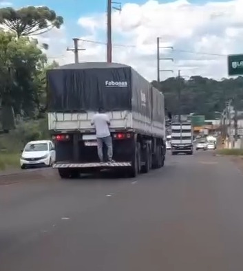 Uma cena de extremo perigo chamou a atenção de quem trafegava pela SC-283, em Chapecó, na tarde desta terça-feira (13). Um homem foi flagrado se segurando no para-choque traseiro de uma carreta em movimento, colocando a própria vida em risco em plena rodovia.