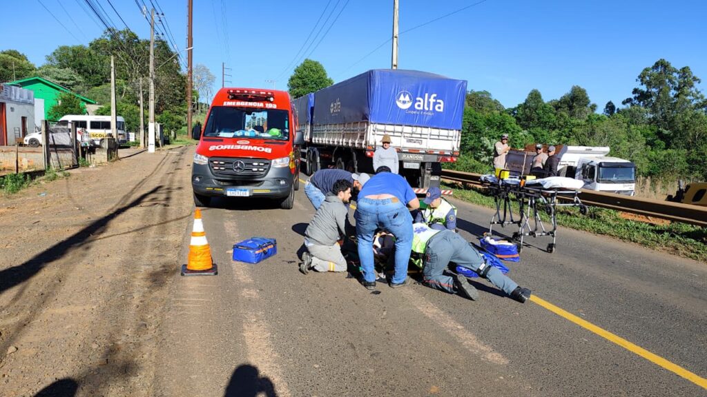 O motorista da carreta acionou imediatamente o Corpo de Bombeiros, que prestou atendimento à vítima. O motociclista apresentava suspeita de fratura no braço e um ferimento leve na cabeça. Ele foi imobilizado e encaminhado para atendimento médico pela equipe de resgate.
