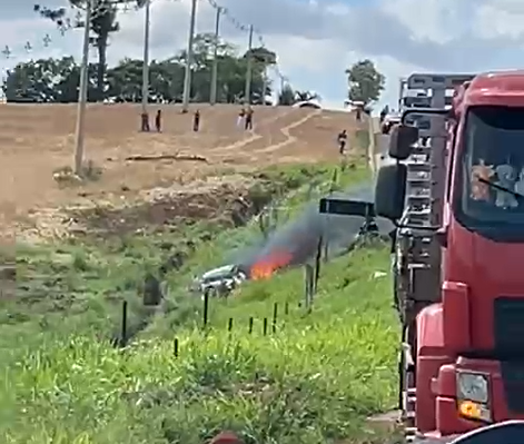 De acordo com informações preliminares, o pneu de um automóvel estourou, fazendo com que o motorista perdesse o controle da direção e o veículo saísse da pista. Após o impacto, o carro pegou fogo, e as chamas precisaram ser controladas por equipes de emergência que atuaram no local.